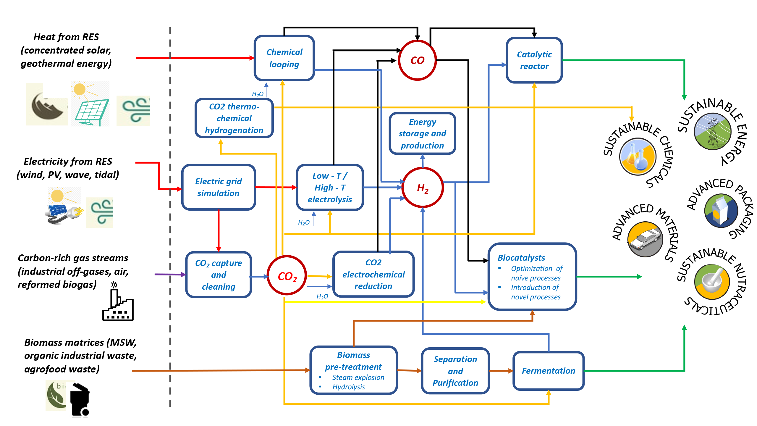 Several value streams for the conversion of waste streams (CO2 or organics in wastewater from industrial processes) to useful products can be outlined, in a circular economy approach, by exploiting renewable energy sources (like water and sunlight or renewably produced H2).