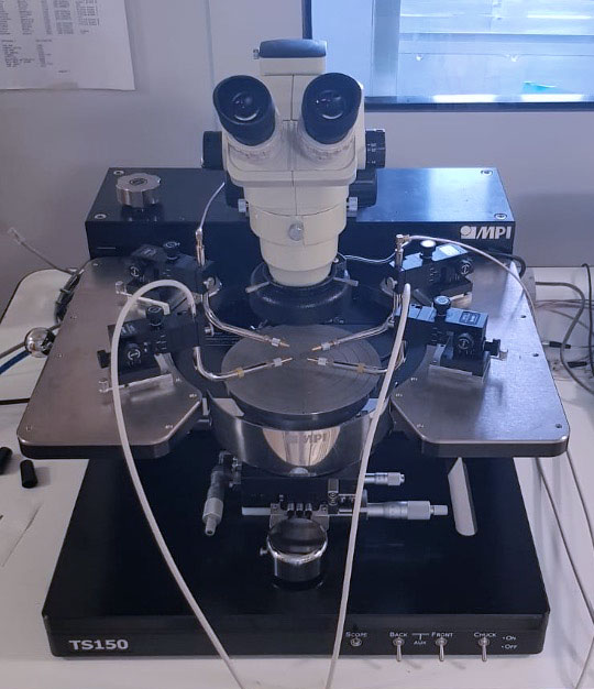 The Probe station has a chuck that can support up to 6" wafers with very fine x, y and angular movement. The top microscope allows the correct alignment of the probes with the devices under test. Up to four probes are available, two of them with triaxial cable for extremely precise electrical measurement; the other two have coaxial connections. The Probe station has a soft contact tool that allows a semi-automatic movement to contact the probe tips to the devices without putting too much pressure.