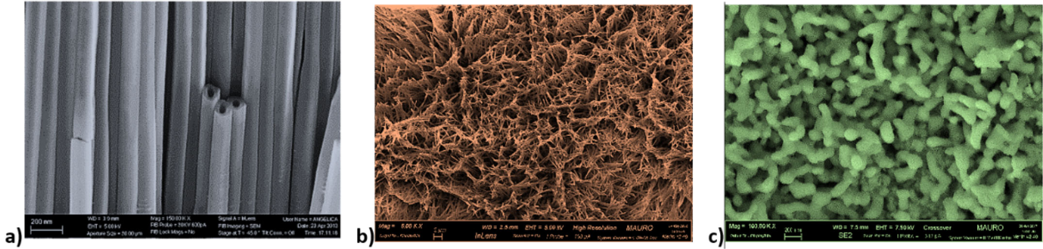 The key advantages of such technology are: i) the polymer can be arranged in a micro/macro porous structure, providing a high surface area to volume ratio; ii) the possibility to collect nanofiber mats, based on several kinds of materials, such as ceramic or carbon based materials, obtained by electrospinning and implementing successively a proper heating treatment; iii) the tuning of ordered distributions of nanofibers, obtained by modulating the electric field during the process