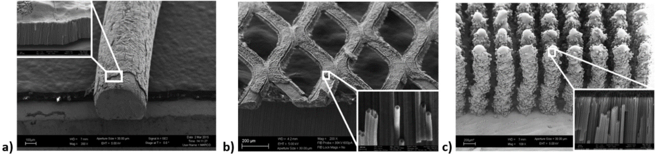 Moreover, the growth of the nanostructures is not dependent on the shape of the metal substrate allowing to open the way to different device architectures such as wire-shaped, mesh type or the additively manufactured 3D pieces.
