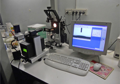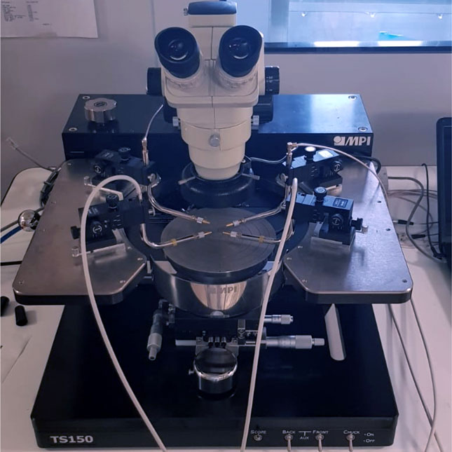 The Probe station has a chuck that can support up to 6" wafers with very fine x, y and angular movement. The top microscope allows the correct alignment of the probes with the devices under test. Up to four probes are available, two of them with triaxial cable for extremely precise electrical measurement; the other two have coaxial connections. The Probe station has a soft contact tool that allows a semi-automatic movement to contact the probe tips to the devices without putting too much pressure.