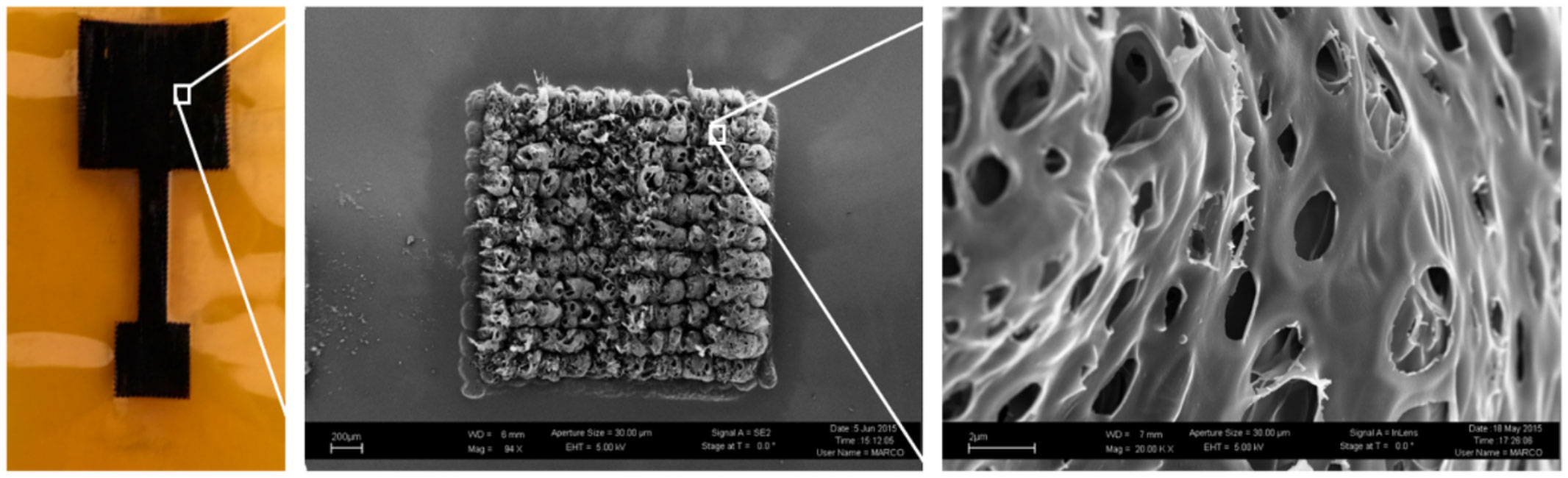 These conductive paths obtained on flexible substrate can be exploited for the fabrication of supercapacitors, batteries, photoelectrochemical solar cells, electrochemical sensors and many other devices that can take advantage from a porous high-surface-area graphene-based network on polymeric substrate.